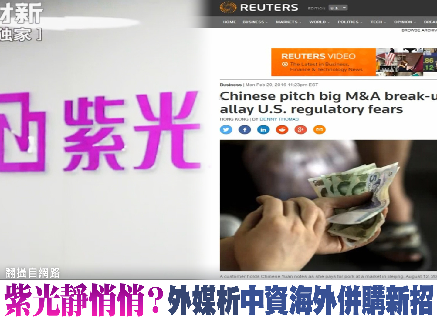 【新唐人亞太台 2016 年 03 月 02 日訊】前陣子中國紫光集團董事長趙偉國來台,頻頻放狠話,作勢要吞下台灣半導體產業,但最近卻安靜許多。財經專家謝金河認為,主因是紫光股價大縮水。而外媒更發現,許多中資企業在進行海外併購時,不惜出高價斡旋金,只為換取少部份股權,以規避審查。