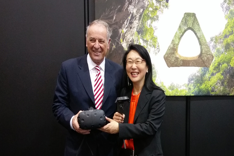 瑞士聯邦前總統體驗Vive 王雪鴻親接待。(宏達電提供)