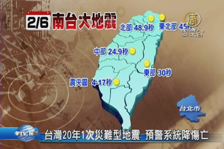 【新唐人亞太台 2016 年 03 月 03 日訊】地震真的可以預測了嗎?以2月南台地震為例,國研院國震中心透過地震預警系統,成功提早4到17秒預警,國震中心指出,台灣過去300年來,平均約20年,就有1次劇烈災難型地震,如果可以更早發現,就可以降低傷亡。