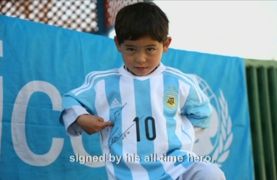 5歲的阿富汗男孩阿瑪迪開心的不能再開心了(Murtaza Ahmadi)他穿著偶像梅西(Lionel Messi)的簽名球衣,在眾人前踢著新足球,這足球上也有梅西的親筆簽名喔。