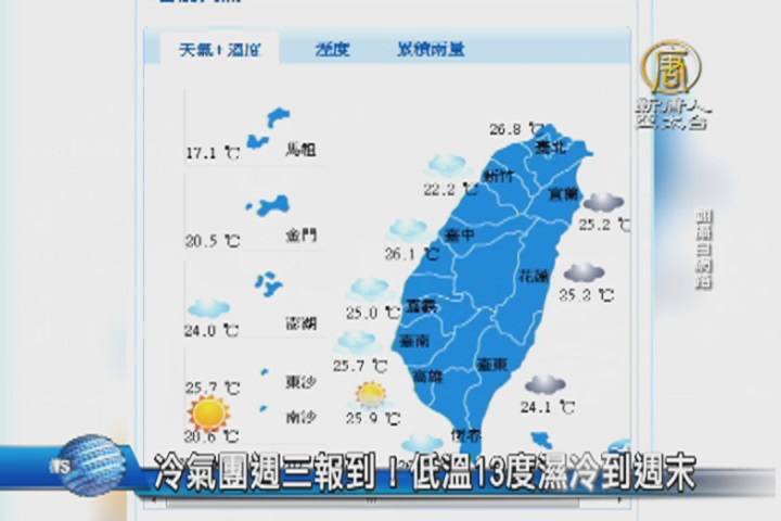 【新唐人亞太台 2016 年 03 月 07 日訊】連日來的好天氣,只剩明天一天了, 今天,西半部最高溫在27到29度,不過,要向好天氣掰掰了,中央氣象局說,週三(9日)開始冷氣團報到,氣溫一路溜滑梯,週四清晨低溫下探13、14度,濕濕冷冷的天氣,將持續到週末。