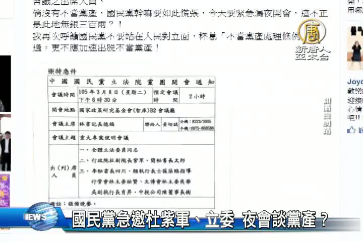 【新唐人亞太台 2016 年 03 月 08 日訊】民進黨立委陳其邁在臉書貼出,國民黨立院黨團發出的今晚「特急件」開會通知,邀請行政院副院長杜紫軍、國民黨全體立委,以及管理黨產兩位關鍵人物、行管會主委林祐賢與中投公司董事長陳樹,召開重大專案說明會議,據了解,這個重大專案指的正是黨產議題。
