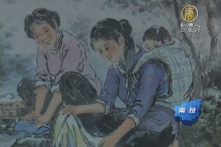 小時候玩橡皮圈的有趣景象、還有用爐灶升火煮飯的畫面、另外這張是辛苦的母親背著小孩在河邊洗衣,這些早年鄉下常見的場景,是南投藝術家黃碧雲,用水墨創作來描寫自己的兒時情景。