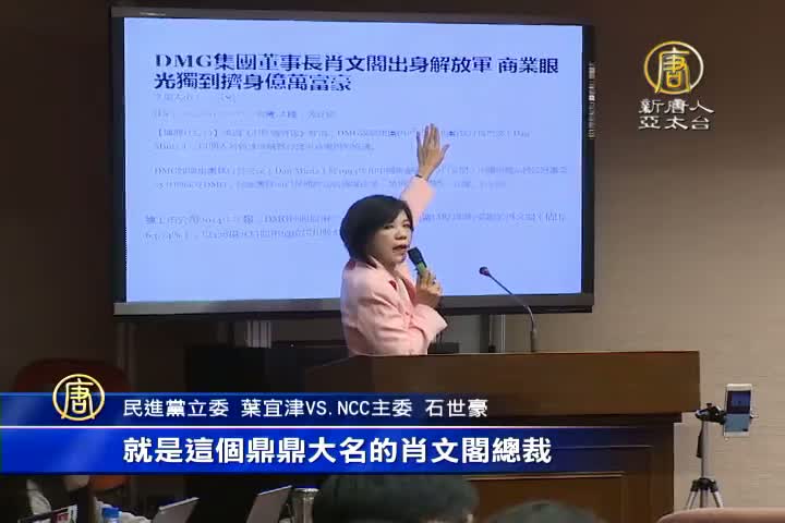 【新唐人亞太台 2016 年 03 月 09 日訊】立法院交通委員會,邀請 NCC主委石世豪列席被詢,立委葉宜津質詢美國DMG集團購買東森股權案,質疑外資集團背後買主有中共解放軍背景。