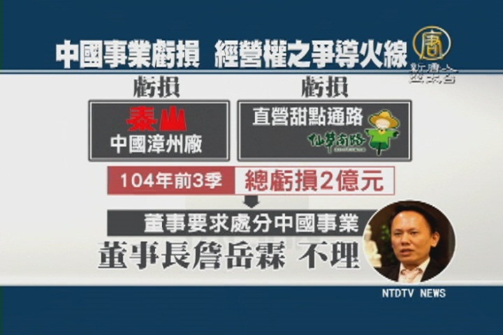【新唐人亞太台 2016 年 03 月 10 日訊】已經有66年歷史的老字號食品廠 泰山企業,驚爆第三代經營權之爭,導火線就是,董事長詹岳霖在中國投資失利,被股東要求處分中國事業,遭到詹岳霖拒絕。監察人詹佩珊昨天公告,要在4月25號,召集臨時股東會提前改選董事,讓現任董事長詹岳霖下台。