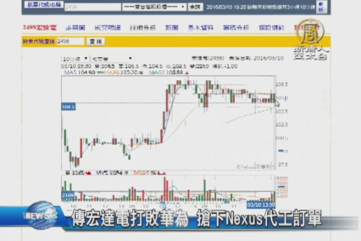 【新唐人亞太台 2016 年 03 月 10 日訊】市場傳出,宏達電打敗華為,拿下Google Nexus手機的3年合約,受到這起消息激勵,宏達電昨天盤中一度漲停,股價以104.5元作收,創下去年6月以來最高。不過宏達電不願評論這個消息。而市場人士分析,Google每年輪流與一家手機大廠合作,所以與宏達電簽下三年約的可能性並不高。而宏達電今天的股價表現,持平。