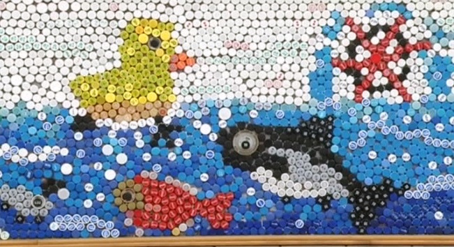 這項由40多位學生和老師共同完成的計劃,從去年10月開始,老師鼓勵學生開始收集塑膠瓶蓋,進行美術創作,同時也藉此創作來傳遞環保信息。