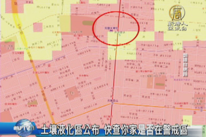 【新唐人亞太台 2016 年 03 月 14 日訊】早安新唐人先帶您來關心,台南強震後的居住安全,行政院今天上午將開放民眾查詢,土壤液化潛勢區。第一波開放雙北、南二都、新竹縣市、宜蘭線與屏東縣,其中被列為「紅區」的高潛勢區,超過2.8萬公頃,包括松山機場、北高捷運,以及台鐵的高雄站、潮州站。另外,總統府、行政院、立法院,也都在在黃色的中潛勢區。民眾進入網頁後,只要在查詢欄中輸入地址,就可以確認在地的土壤液化警戒等級。