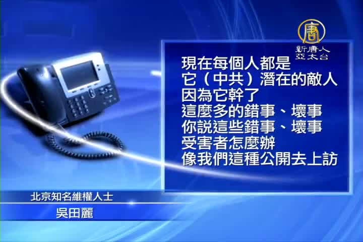 北京知名維權人士 吳田麗:「現在每個人都是它(中共)潛在的敵人,因為它幹了這麼多的錯事、壞事,你說這些壞事、錯事受害者怎麼辦?像我們這種公開去上訪,那些沒公開的它們也是受害者啊,所以對它來講,弄不好每個人都是它的敵人,都在它的視線之內進行監控吧。」