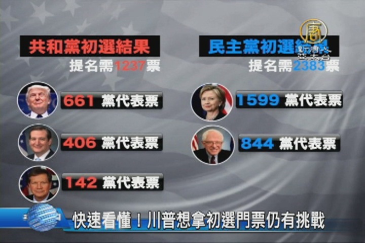 【新唐人亞太台 2016 年 03 月 17 日訊】剛過去的這個超級星期二,2016美國總統初選關鍵選戰,雖然共和黨主流派魯比歐選擇退選,但地產大亨川普,想代表共和黨出征,依照選制來看,還不是那麼容易,請看我們紐約記者李大宇的分析。