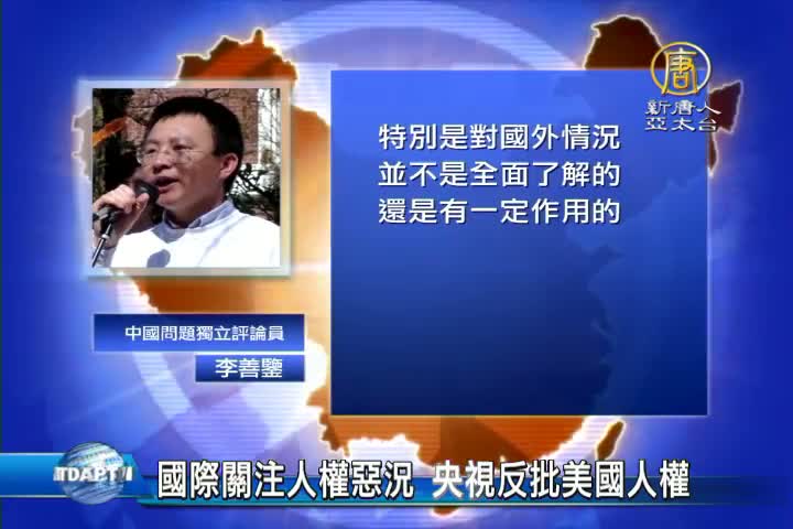 中國問題獨立評論員 李善鑒:「應該說就是被人揭了傷疤的一種狗急跳牆的反應——那你說我不好,我趕緊去說你不好。而且它對美國的人權報告對中國可能造成的影響,還要做一些『消毒』。因為它從來給中國人灌輸的思想——『你看,別人都那麼那麼樣,別人怎麼怎麼不好』。用這種『別人不好,所以不能說我們哪』等等這種心理來毒害民眾。