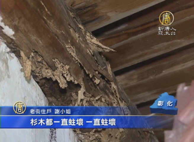 鹿港老街的古建築,一向能吸引觀光客的目光,但仔細一瞧,杉木都有白蟻蛀蝕的痕跡,有的樑柱甚至被蛀出個大窟窿來,最近雨下個不停,還會漏水,情況更為嚴重,住戶苦不堪言。