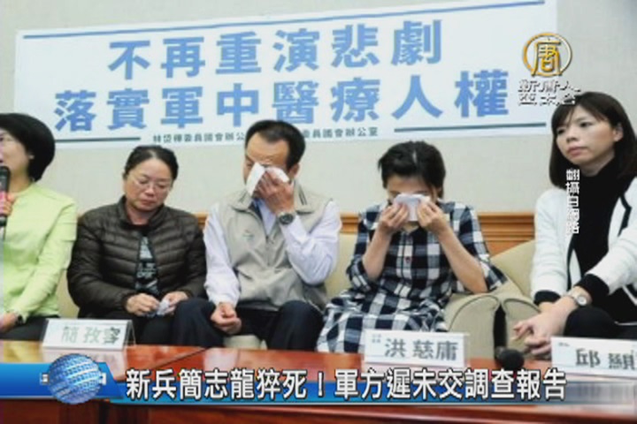 【新唐人亞太台 2016 年 03 月 18 日訊】再來看到,憲兵訓練中心新兵簡志龍,2015年疑似因軍方延誤就醫喪命,但時隔4個月,家屬等不到軍方的調查報告,今天(18日)家屬特別北上開記者會,痛批軍方卸責,沒想到軍方辯稱,要等桃檢調查後才能行政懲處,被時代力量立委洪慈庸打臉,洪慈庸要求,軍方2週內,交出懲處名單。