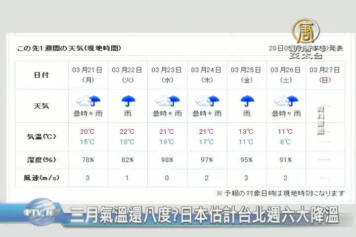 【新唐人亞太台 2016 年 03 月 20 日訊】晚間頭條先來看到,已經快三月底了,天氣還是冷颼颼。根據日本的民間天氣公司「日本氣象協會」預估,台北本周五(25日)氣溫會大幅下降,周六最低溫將只有 8度。不過氣象局表示,到時雖然有冷空氣來,但目前預估最低溫,大約還是有14度;更詳細的天氣變化,還要一、兩天後,才會比較明朗。