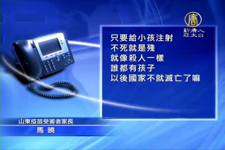 山東疫苗受害者家長 馬曉:「就是國家衛生系統的腐敗和監管不力,才會導致有這麼多漏洞,那高溫的(疫苗),說白了就是假的,只要給小孩注射,不死就是殘,就像殺人一樣,誰都有孩子,以後國家不就滅亡了嘛。」