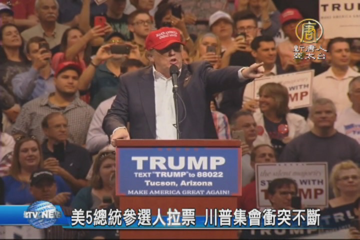 【新唐人亞太台 2016 年 03 月 21 日訊】歡迎回來。川普爭議,仍舊佔據美國大選初選新聞版面。共和黨競選中,一路領先的川普,在亞利桑那州舉行集會。支持者和反對者之間,仍舊是衝突不斷。