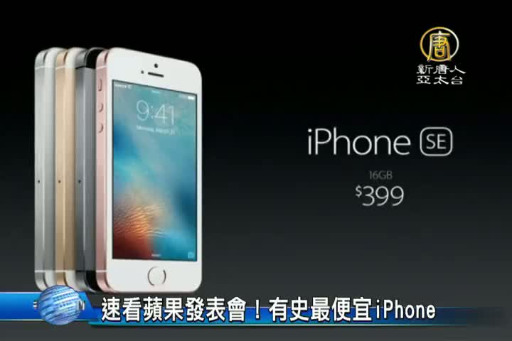 【新唐人亞太台 2016 年 03 月 22 日訊】早安新唐人,先帶您看到,就在台灣時間今天凌晨1點,蘋果公司舉行新品發表會,這次全程只有短短 1 個小時,產品包括,長得跟iPhone 5S相同的iPhone SE、與9.7寸iPad Pro,以及,語音助理 Siri將為Apple TV帶來新的體驗。值得注意的是,Apple Watch全面降價,iPhone SE的台灣價格也出爐,16GB 新台幣 1萬5千元,被認為有史以來最便宜的iPhone。另外,蘋果還宣布啟動 回收計劃,並有機器人專門來拆解iPhone。