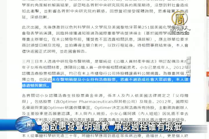 【新唐人亞太台 2016 年 03 月 24 日訊】被捲入浩鼎風波的中研院院長翁啟惠,剛剛發表聲明稿,除了對發言思慮不周深感抱歉,也說自己「未在聲明稿提及小女持有浩鼎股票,思慮不周造成社會大眾誤會,深感遺憾與歉疚。」更在最後強調,他從事醣科學研究逾三十年,「腦海裡從未浮現個人利益的考量,更不會圖利自己的家人。」「堅信沒有做出任何對不起良心之事,但過程確有瑕疵,造成各界困擾,萬分難過。」
