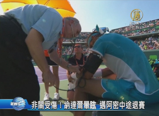 【新唐人亞太台 2016 年 03 月 27 日訊】西班牙蠻牛納達爾26日在邁阿密網球賽第二輪賽事的第3盤中途退賽,但似乎與受傷無關。納達爾因為感覺頭暈,加上當地天氣炎熱潮濕,在擔心自己身體安全的狀況下退賽。這是6年多來,納達爾首次中途退賽。
