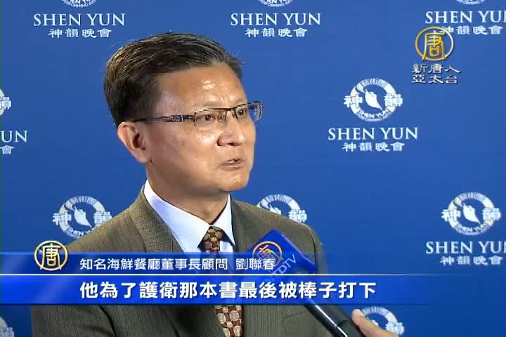 【新唐人亞太台 2016 年 03 月 29 日訊】美國神韻世界藝術團3月26日晚間,在高雄市文化中心的演出, 知名海鮮餐廳董事長顧問劉聯春,感動到幾乎哽咽。他說神韻節目內涵所貫穿的精神,喚醒人性最本初的善良,讓他的內心激動不已。
