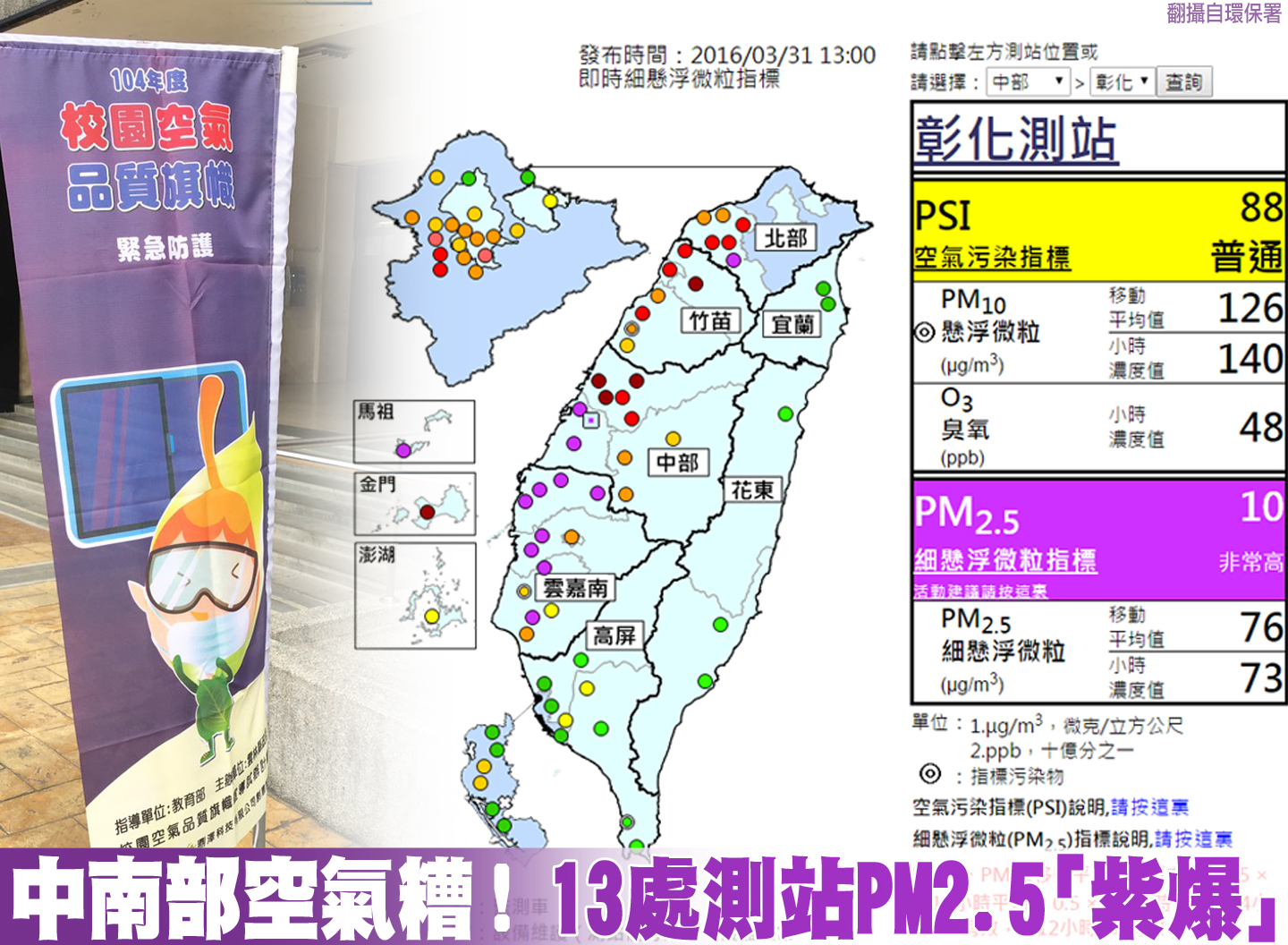 【新唐人亞太台 2016 年 03 月 31 日訊】歡迎回來,中部地區今天空氣品質差,截至中午,從空氣品質監測網顯示,西屯、忠明、彰化、斗六、麥寮等中南部地區有13處測站的PM2.5指標,達到「紫爆」等級。天空灰濛濛的一片,小學也都擺出了紫色空汙旗,提醒中南部地區的民眾,最好減少外出,或戴口罩。