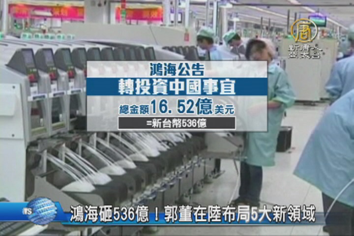 【新唐人亞太台 2016 年 03 月 31 日訊】鴻海除了入主夏普,在中國也有動作。昨天,鴻海宣布轉投資中國,金額高達16.52億美元,約新台幣536億元。布局手機、光學鏡片、精密機械自動化系統以及智能機器人等五大領域。