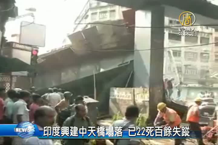 【新唐人亞太台 2016 年 04 月 01 日訊】早安新唐人,先帶您看到,印度加爾各答一條興建中的天橋昨天突然倒塌,由於事故地點位於市區繁忙道路上,塌落的橋段長100公尺,據目擊者表示,當時人車通過,大批民眾受波及,已造成至少22人死亡,目前還有大約上百人受困在瓦礫堆下。這座位於鬧區長2公里的天橋,自2009年就開始興建,已經數度延後完工。