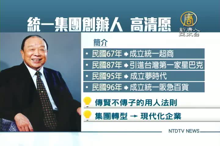 【新唐人亞太台 2016 年 04 月 01 日訊】統一集團創辦人高清愿辭世、享壽88歲,他一生宛如台灣食品發展史,包括義美總經理高志明、全聯總裁徐重仁今天都對他表示哀悼、緬懷,稱讚高清愿的理念「三好一公道」,以及,用人「重品格更勝於能力」。