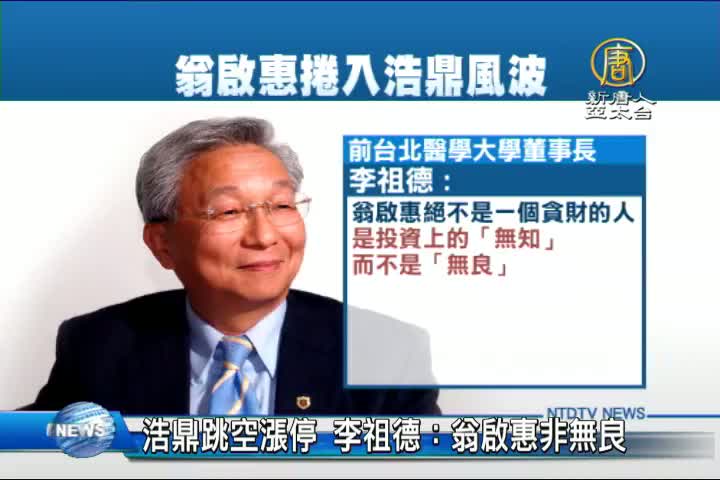 【新唐人亞太台 2016 年 04 月 01 日訊】繼續看到,生技大廠浩鼎,昨天發布 獲邀美國ASCO報告的消息,浩鼎股價今天跳空漲停,前台北醫學大學董事長李祖德,親自發函力挺中研院長翁啟惠。他表示,翁啟惠絕不是一個貪財的人,是投資上的「無知」,而不是「無良」 。