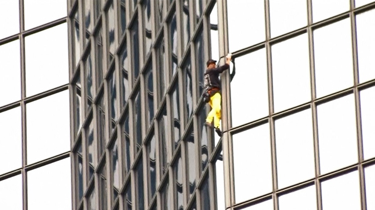 上班族們在下面看得嘖嘖稱奇,他剩最後一步就上去了,從攝影機看上去,感到特別驚險,但對羅伯特來說似乎是家常便飯,輕輕鬆鬆就完成蜘蛛人的掉髮日任務。