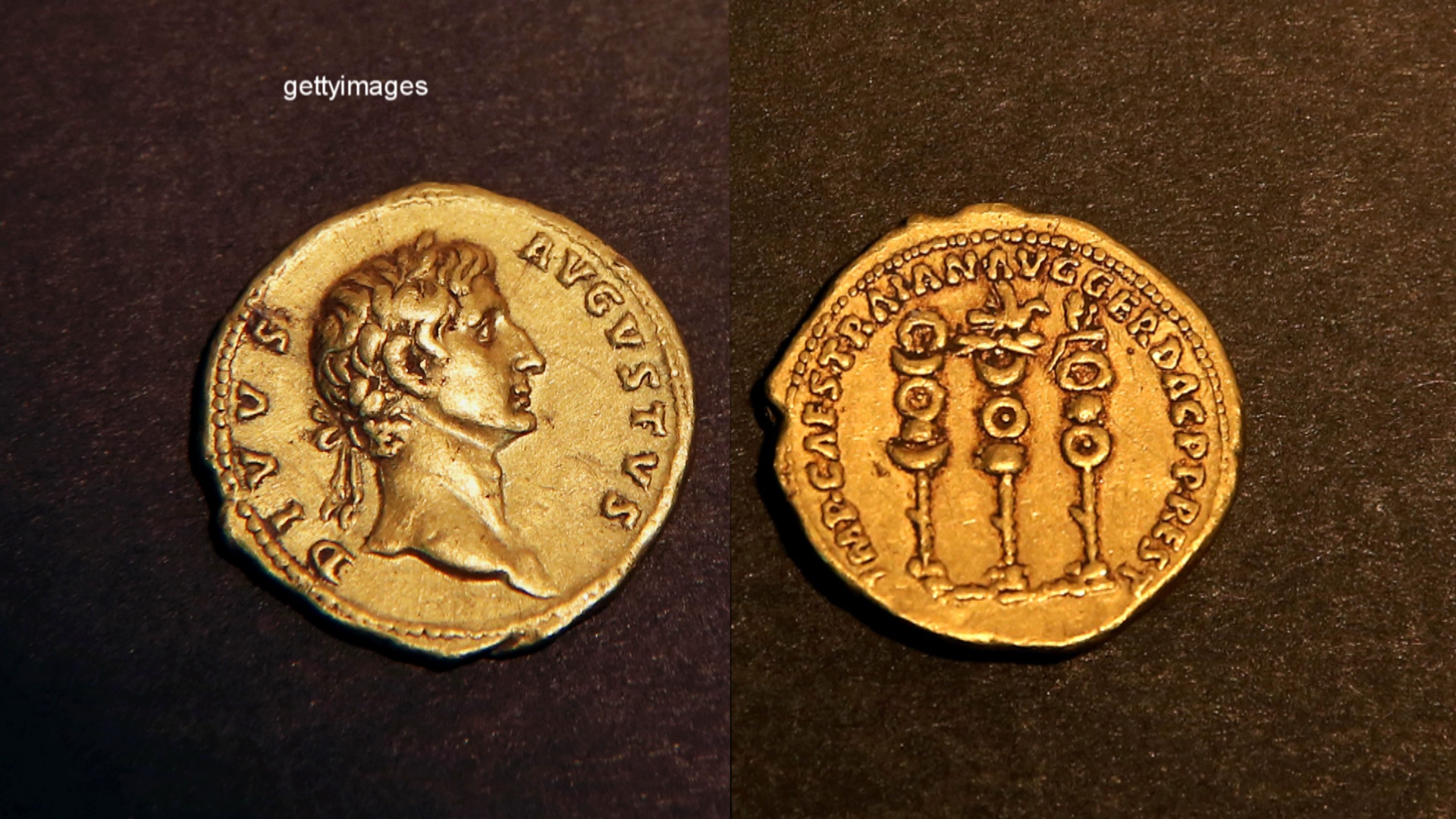 「從建立羅馬帝國的奧古斯都而後的每一位繼承者,一直到圖拉真的父親涅爾瓦,圖拉真為每一位都製造了金幣。這樣的金幣當時並沒有大量製造,而這一枚剛好是羅馬帝國的創始者奧古斯都。」