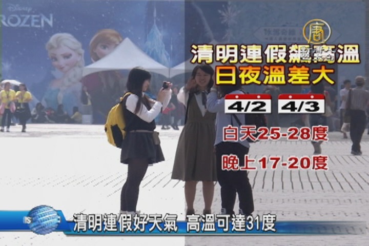 天氣變熱,日夜溫差也大,白天25~28度,晚上低溫降為17~20度。不過等到連假後兩天,週一跟週二(4月4、5日),天氣會稍微涼快一些。