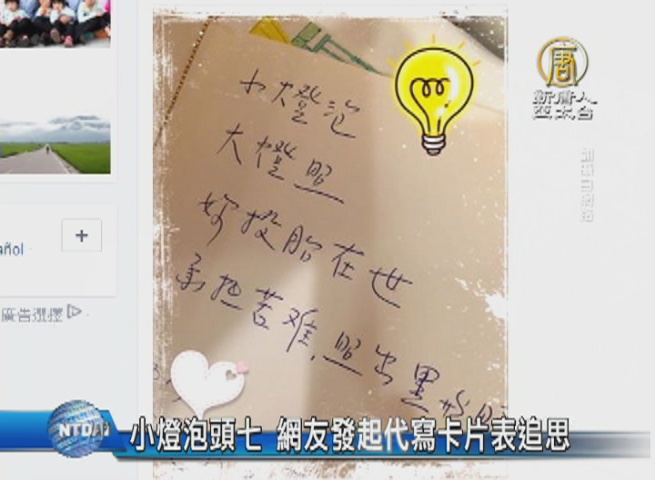 【新唐人亞太台 2016 年 04 月 03 日訊】再來看到,今天是內湖女童小燈泡的頭七,陸續有民眾前往小燈泡的靈堂寫卡片致意。有網友發起代寫卡片活動。而小燈泡的母親,今天也在臉書PO文,說小燈泡曾經童言童語說自己以後會變成大燈罩,媽媽說,直到現在,她終於明白了。