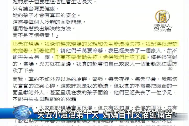 【新唐人亞太台 2016 年 04 月 06 日訊】台北市內湖區4歲女童小燈泡命案,引起全台輿論痛心,小燈泡媽媽之前持續呼籲外界從家庭與社會著手,杜絕隨機殺人;一直到昨天深夜,她才首次發文,談到自己內心的巨大苦痛。她透露,案發當天,她深怕趕來現場的父親和先生崩潰後失控,當場,兇刀就在腳邊,她抱著、抓著他們,請他們千萬不要衝動失控,免得也犯了罪。小燈泡的媽媽說,「現場畫面很慘,但只有我知道,每每那段畫面閃入腦海,我還是崩淚到幾乎無法喘氣。」「這是一輩子的失去。我真的,就只是個平凡的母親而已。」許多臉書好友在留言下打氣,紛紛表達心疼,願意與小燈泡的父母一起努力渡過艱難的時刻。