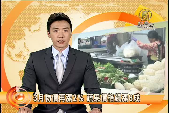 【新唐人亞太台 2016 年 04 月 08 日訊】主計總處昨天公布3月消費者物價總指數,年增率CPI大漲2%,接連第二個月物價漲幅達到2%,連續7個月上揚。消費者物價指數大漲主要是因為蔬菜水果飆漲,蔬菜漲幅將近八成,導致食物類價格大漲8.62%,創下43個月以來的最大漲幅。