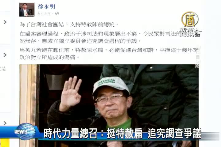 【新唐人亞太台 2016 年 04 月 08 日訊】新舊政府交接之際,特赦阿扁議題再受關注,時代力量立法院黨團總召徐永明下午也在個人臉書表態支持,他說,這十幾年來因為政治對立造成許多傷痛,假如馬總統可以在卸任前特赦陳水扁,或多或少都能夠撫平這些傷痕。為了台灣社會團結,支持特赦陳前總統。另外,對於扁案審理過程中,政治干涉司法的現象,徐永明建議中央應成立獨立委員會追究調查過程的爭議。