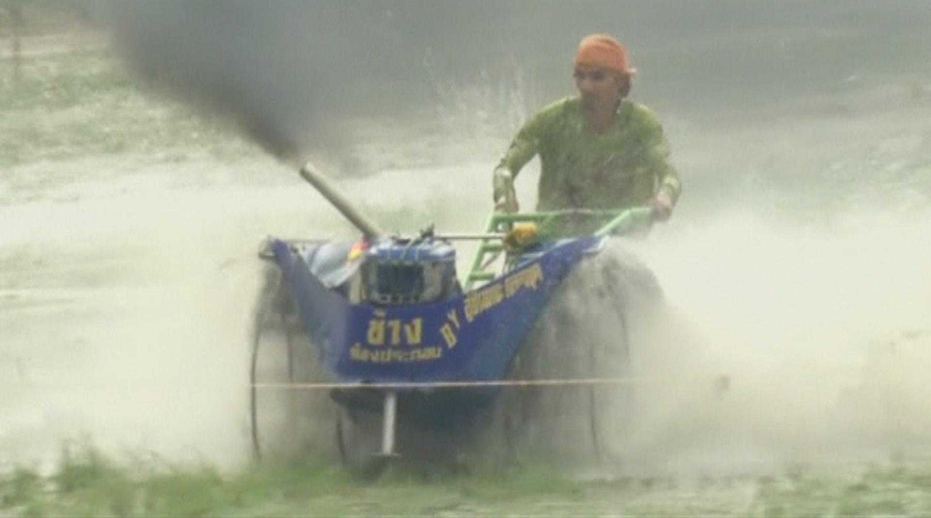 岸邊滿滿的群眾,農耕機發出轟轟的聲響,在積著水像個小河道的田野上,快速的前進著。(3月27日)在泰國的一群農夫把他們的工作放下,運轉起他們的農耕機,把一塊積了水的田野變成了一條300公尺的賽道,相互大戰一場,看看誰的機器跑得最快。