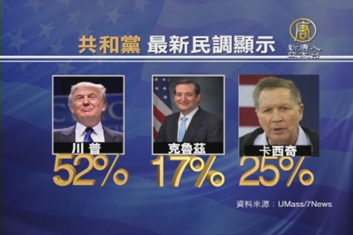 最新民調顯示,目前川普大幅領先。川普獲的52%的支持率,克魯茲和凱西克支持率分別是17%和25%。