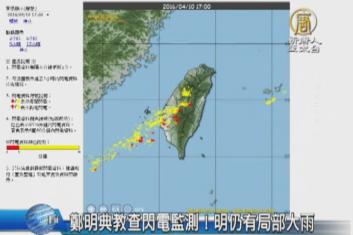【新唐人亞太台 2016 年 04 月 10 日訊】新聞頭條,先帶觀眾朋友看到,鋒面午後報到,今天彰化以北地區都有局部大雨,氣象局預報中心主任鄭明典今天在臉書上,教網友查訊氣象局的即時閃電監測系統,紅色是最近5分鐘的閃電紀錄,黃色是1小時內的紀錄,提醒民眾小心雷擊。明天,上班日的天氣,北部高溫會降到23到26度,仍然會有局部大雨,這波雨勢會一直下到星期五(15日),星期六(16日),天氣會再度轉好。