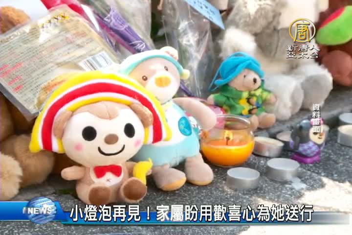 【新唐人亞太台 2016 年 04 月 12 日訊】內湖4歲女童小燈泡命案,明天上午將在台北市立第一殯儀館舉辦歡送會, 小燈泡家屬透過禮儀公司發聲明表示,事件發生後,各界民眾給予小燈泡滿滿的愛與關心,全家人表達感激與感謝,也希望民眾放下所有怨懟與仇恨,小燈泡媽媽希望懷抱著歡喜心替小燈泡送行。