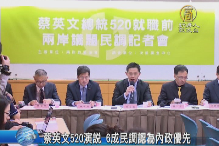 【新唐人亞太台 2016 年 04 月 14 日訊】兩岸政策民調公布蔡英文520演說相關民調,六成民眾認為蔡英文應該著重內政議題,而非兩岸議題,5成9民眾認為蔡英文不應該在演說中提到兩岸同屬一中。近5成民眾認為兩岸減緩交流,北京當局應負起更大責任,學者則是認為,民眾預料中共520之後,將對新政府有更多打壓行為。
