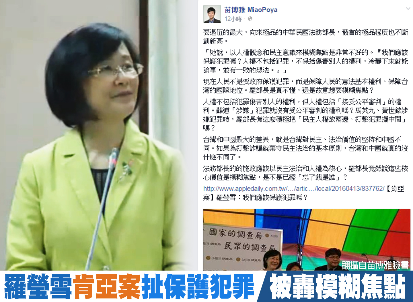 【新唐人亞太台 2016 年 04 月 14 日訊】肯亞事件延燒,台灣政府持續向中共要人,但法務部長羅瑩雪昨天卻拋出「我們應該要保護犯罪嗎?」的言論,再度引發爭議,而網路上還流傳一篇署名「詐騙產業公會感謝聲明」的文章,想要諷刺近來台灣的抗議。不過,社民黨成員 苗博雅今天在臉書上貼文說,現在人民不是要政府保護犯罪,而是保障人民的憲法基本權利、保障台灣的國際地位。苗博雅批評,羅瑩雪是真的不懂,還是故意想要模糊焦點?