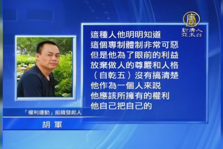 中國「權利運動」發起人 胡軍:「這種人他明明知道這個專制體制非常可惡,但是他為了眼前的利益放棄做人的尊嚴和人格。(自乾五)沒有搞清楚他作為一個人來說,他應該所擁有的權利,他自己把自己的人的定位都擺錯了。我覺得他們應該好好反省一下自己,做人一個最基本的概念,他們應該去重新去認識。」
