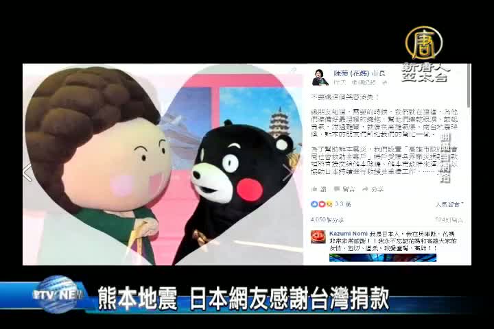 【新唐人亞太台 2016 年 04 月 17 日訊】日本九州熊本強震造成嚴重災情,馬總統也指示要追加50萬美元賑災,總計約1900萬元給日本政府,台灣捐款的新聞也成日本雅虎的熱門新聞。日本雅虎報導,包括柯文哲、林佳龍、賴清德、陳菊,都捐出一月所得。而民進黨主席,蔡英文也指示民進黨捐出100萬台幣。日本網友紛紛在下面留言感謝,日本網友說:「患難見真情」、「感謝台灣」、「台灣人總是很親切」。