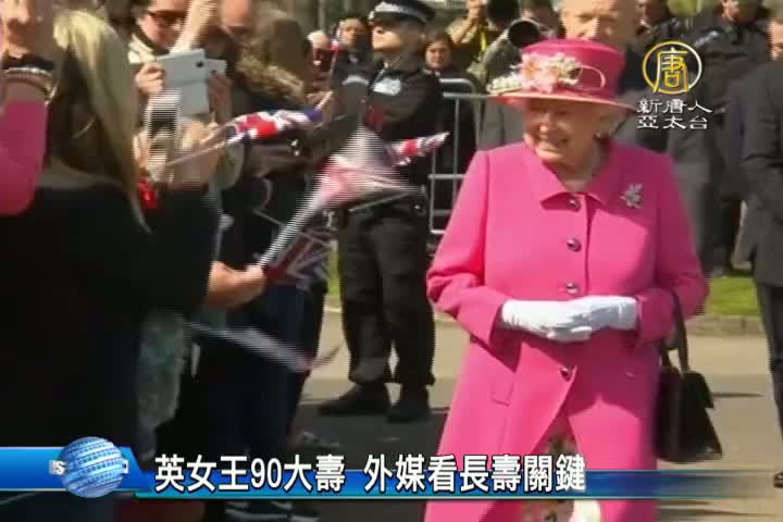 【新唐人亞太台 2016 年 04 月 21 日訊】英國女王伊麗莎白二世21日將年滿90歲,成為英國史上在位最久、同時也最長壽的君主,外媒報導,女王長壽的原因,包括優質的基因,女王的外公外婆都分別活到89歲和75歲。另外,女王注重養生,不吸菸、酗酒;晚餐不吃澱粉食物;另外,女王固定運動、不久坐,每天固定早起、睡眠約7小時。外媒還說,女王的婚姻幸福美滿,也是幫助她健康長壽的原因。