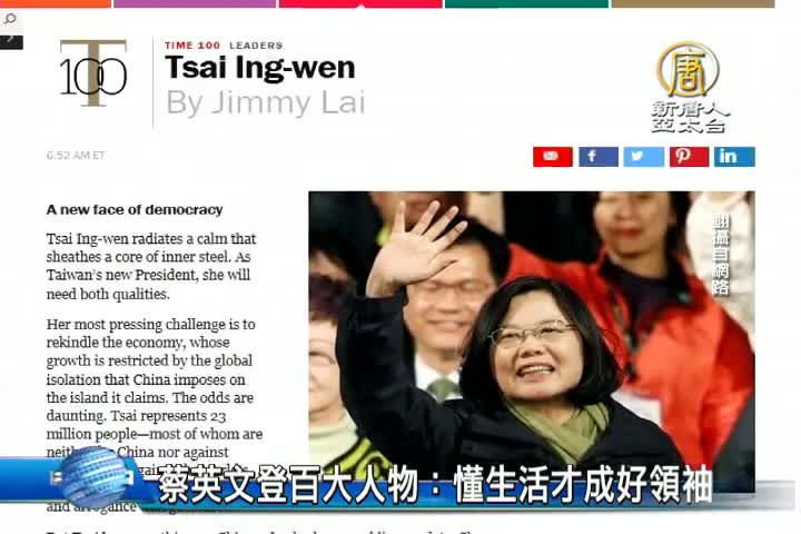 【新唐人亞太台 2016 年 04 月 22 日訊】美國《時代》雜誌一年一度的百大影響人物出爐,台灣準總統蔡英文也入榜。《時代》雜誌慣例都會勘出介紹文,這次由壹傳媒創辦人黎智英撰寫,內容提到,蔡讓中國知道,民主可以和平達成,到蔡英文家中餐敘,她會帶來一瓶上好法國紅酒,並笑稱只有懂得享受生活的人,才能當個好領袖,因為懂得享受生活,才會珍惜別人也追尋的美好事物。