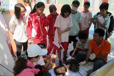嘉義縣生態保育協會介紹兩億年的活化石「鱟」,阿兵哥叫牠鋼盔魚。(圖/嘉義縣政府提供)