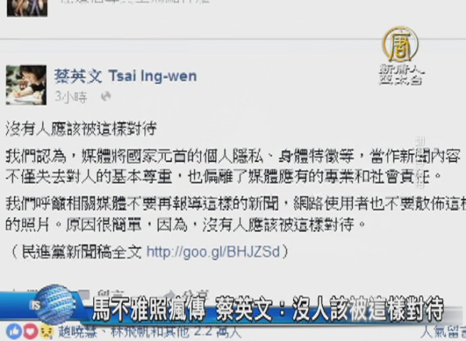 【新唐人亞太台 2016 年 04 月 23 日訊】再來看到,馬總統今天(23)出席公開活動時,在路跑暖身時被拍下不雅照,遭網友瘋傳。總統府表示非常遺憾,並對公開照片的行為予以譴責。而總統當選人蔡英文在臉書上發文,表示沒有人應該被這樣對待,媒體將國家元首的個人隱私、身體特徵等,當作新聞內容,不僅失去對人的基本尊重,也偏離了媒體應有的專業和社會責任。