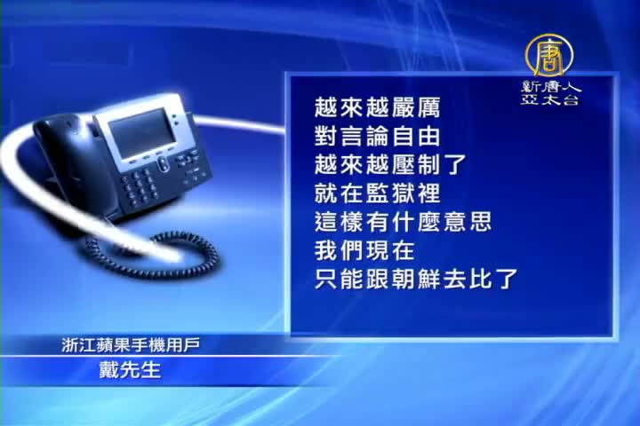 浙江蘋果手機用戶 戴先生:「蘋果手機我在用,但是我現在沒怎麼有興趣了,現在就當一個手機用了,對政治現在已經是絕望了,越來越嚴厲,對言論自由又越來越壓制了,就在監獄裡,這樣有甚麼意思,我們現在只能跟朝鮮去比了。」
