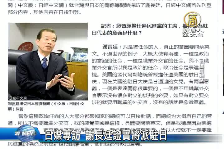 【新唐人亞太台 2016 年 04 月 27 日訊】新政府閣員名單還沒有完全公布,不過,日本經濟新聞今天刊出前行政院長謝長廷的專訪,專訪中謝長廷向日媒證實,即將接任駐日代表。謝長廷表示,自己不是職業外交官,所以是政治的任命,政治任命是表達總統當選人蔡英文對台日關係的重視。謝長廷說,能夠協助幫忙新政府讓台日關係更上一層,同時為日本和台灣人民服務,他認為是人生的一個圓滿,很高興接受這項任命。